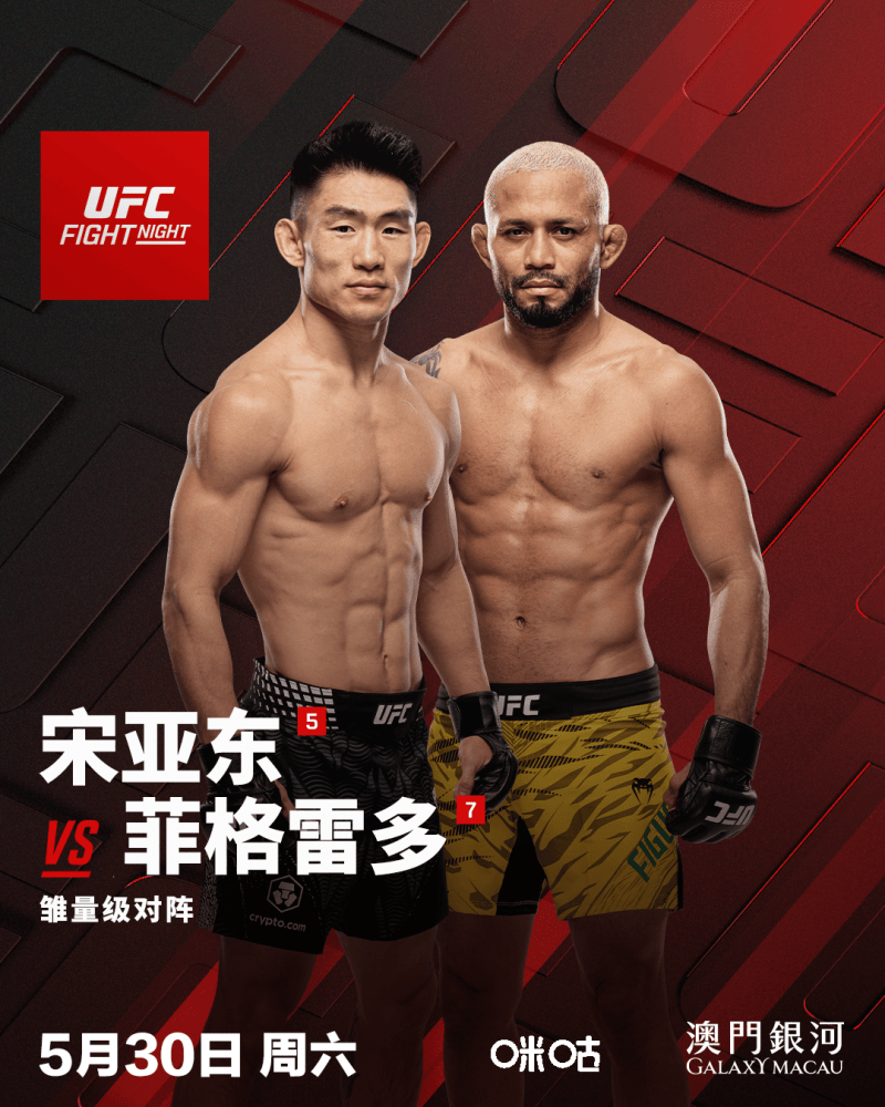 3月13日,世界顶级(ji)综合格斗组织UFC(终极格斗冠军赛)官(guan)方宣布,备受期待的UFC格斗之夜将(jiang)于5月30日在澳门最(zui)大的室内综艺馆银河综艺馆打响,并公布了头条主赛阵容。UFC雏量级(ji)排名第五的宋亚东将(jiang)对阵前(qian)两届UFC蝇量级(ji)冠军、目前(qian)雏量级(ji)排名第七的戴维森-菲格雷多。